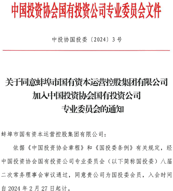 熱烈祝賀蚌埠國控集團加入中國投資協會國有投資公司專業委員會
